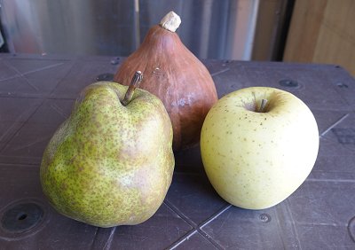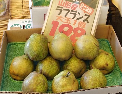 野菜売り場でかぼちゃやリンゴとラ・フランスを並べてみました。