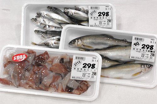 楽しめる魚、静岡産の養殖アユは塩焼きに、青森産の生イカはさまざまな料理